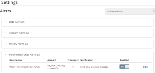 Alerts remind you of important events, warn you about the status of each of your accounts, and notify you when transactions occur. Some alerts are automatically generated by the system, such as security alerts, but some alerts you can create and customize.